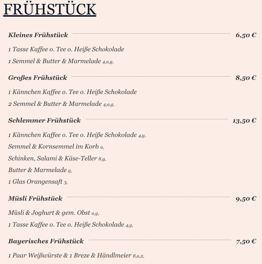 8,50 €1 Kännchen Kaffee o. Tee o. Heiße Schokolade 4,g, Semmel & Kornsemmel im Korb a, Schinken, Salami & Käse-Teller 8,g, Butter & Marmelade g, 1 Glas Orangensaft 3,