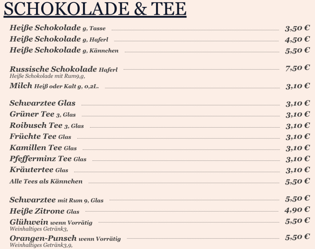 6,50 €1 Kännchen Kaffee o. Tee o. Heiße Schokolade 2 Semmel & Butter & Marmelade 4,a,g,