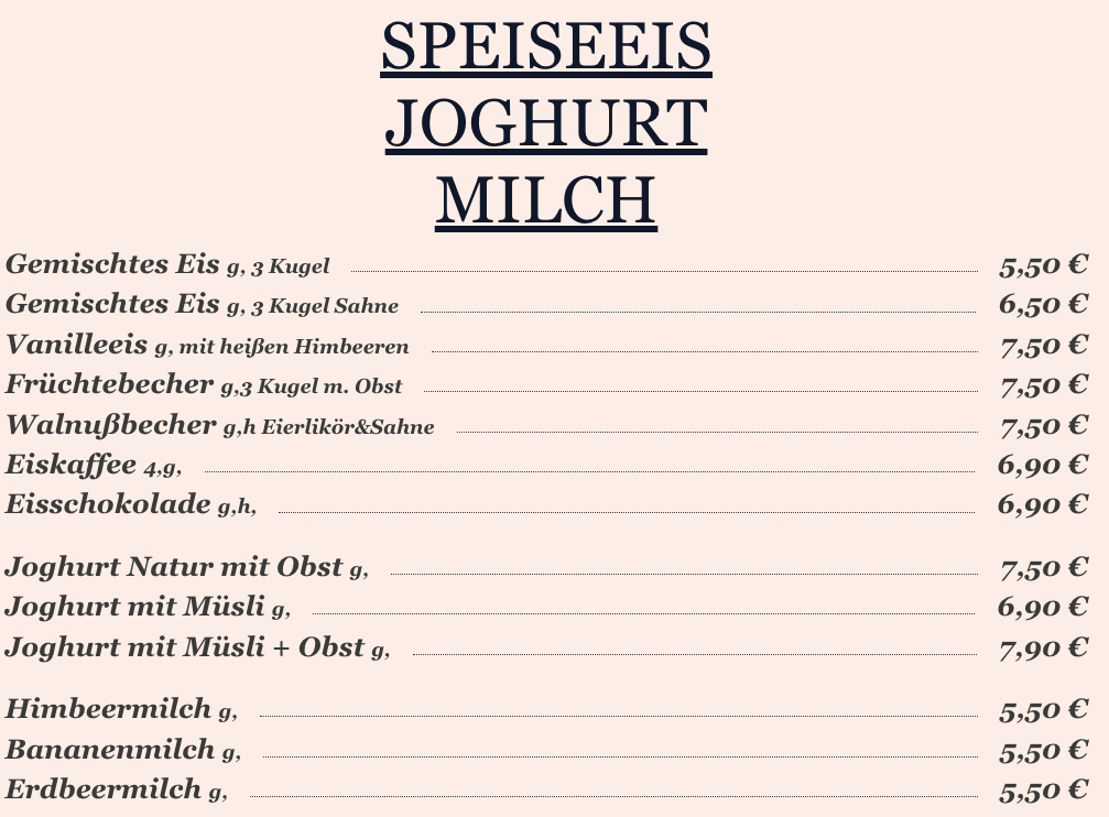 In allen Preisen ist das Bedienungsgeld und die MWSt enthalten.
